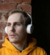 The inside of a bus is captured, showing two passengers seated. The interior features metal handrails, fabric-covered seats, and overhead handles for standing passengers. The focus is on the back of the bus seats and parts of the people seated, with signage and a payment terminal visible near the entrance.